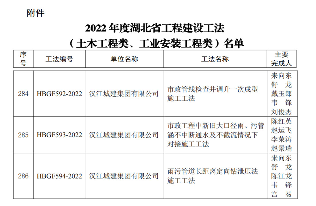 近日,湖北省住房和城鄉(xiāng)建設(shè)廳發(fā)布了《關(guān)于2022年度湖北省工程建設(shè)工法(土木工程類、工業(yè)安裝工程類)評審結(jié)果的公告》,對審定通過的331項湖北省工程建設(shè)工法進(jìn)行了公布,由漢江城建完成的《市政管線檢查井調(diào)升一次成型施工工法》《市政工程中新舊大口徑雨、污管涵不中斷通水及不截流情況下對接施工工法》《雨污管道長距離定向鉆泄壓法施工工法》三項工法獲評湖北省級工法。