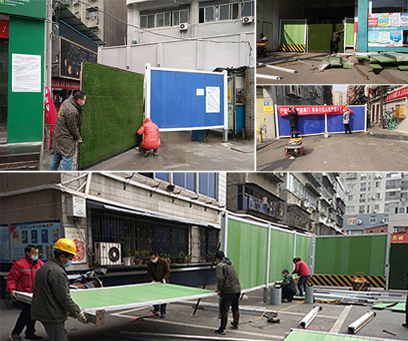 2月1日,在市政實力工程處二期供暖施工現(xiàn)場,經(jīng)理周毅峰為大家準(zhǔn)備好了口罩、消毒水等防控物資,并同大家一起安裝PVC圍檔36米,輔綠植72平方,安裝反光標(biāo)36米。2月4日---2月7日,在樊城立業(yè)路八個“重疫情街道”,大家冒著有可能被感染的危險,在做好自身防護(hù)的前提下,安裝了大門8扇、PVC圍檔24米。2月14日,在寒潮來臨之際,上級領(lǐng)導(dǎo)要求把川惠大酒店鋪設(shè)成臨時收置疑似病人場所,一天的時間要安裝大門4扇,PVC圍檔114米,綠植228平方,反光標(biāo)114米,時間短,任務(wù)重,天空還下著雪花,但交安公司的全體員工發(fā)揚(yáng)吃苦耐勞的精神,克服困難,保質(zhì)保量的完成了上級交給的任務(wù);丶視r,已是凌晨二點。2月15日,在滕天閣施工現(xiàn)場,因雨雪熔化,造成圍檔基礎(chǔ)下沉,存在安全隱患。雖然張建毅和袁超只睡了幾個小時,依然義無返顧去施工現(xiàn)場,整理修復(fù)硬質(zhì)圍檔15米。2月19日,城市交通都被禁止通行的情況下,經(jīng)理周毅峰請派出所的執(zhí)法車輛裝材料,去立業(yè)路金茂小區(qū)及米公所安裝大門2扇,PVC圍檔42米、反光標(biāo)42米。