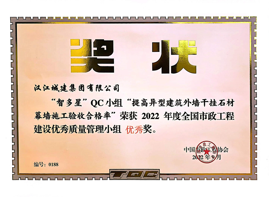 近日,2022年度全國市政工程建設(shè)質(zhì)量管理小組活動成果評選落下帷幕,由漢江城建“實力先鋒”QC小組完成的參賽成果《提高夏季苗木種植存活率》榮獲2022年度全國市政工程建設(shè)優(yōu)秀質(zhì)量管理小組二等獎;由“智多星”QC小組完成的參賽成果《提高異型建筑外墻干掛石材幕墻施工驗收合格率》榮獲全國市政工程建設(shè)優(yōu)秀質(zhì)量管理小組優(yōu)秀獎。