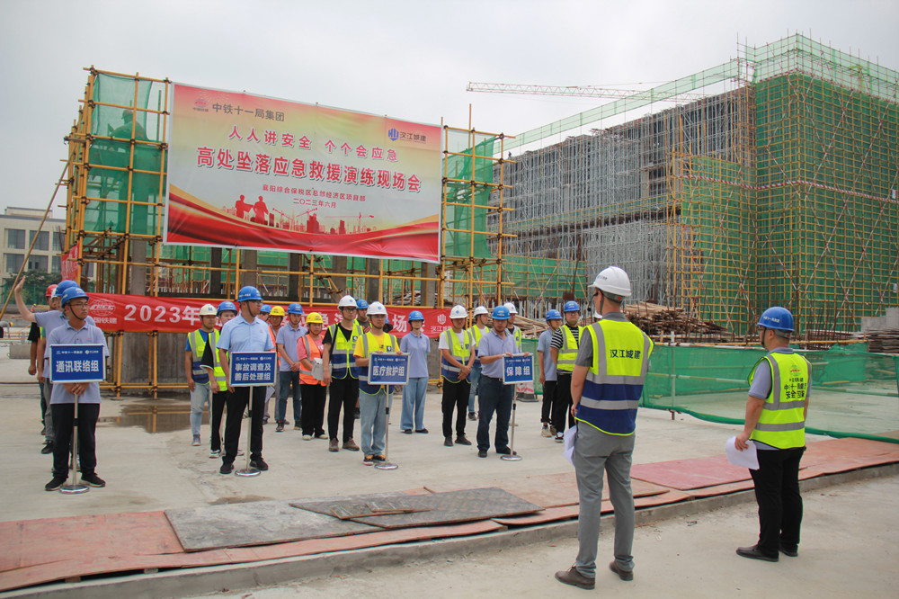 今年6月是全國第22個“安全生產(chǎn)月”,圍繞“人人講安全,個個會應(yīng)急”的主題,6月27日上午,施工單位漢江城建集團(tuán)有限公司、中鐵十一局集團(tuán)有限公司聯(lián)合建設(shè)單位襄陽國際陸港投資控股有限公司、監(jiān)理單位東風(fēng)鴻遠(yuǎn)工程咨詢有限公司在襄陽綜合保稅區(qū)總部經(jīng)濟(jì)區(qū)項目施工現(xiàn)場開展高處墜落應(yīng)急演練活動。