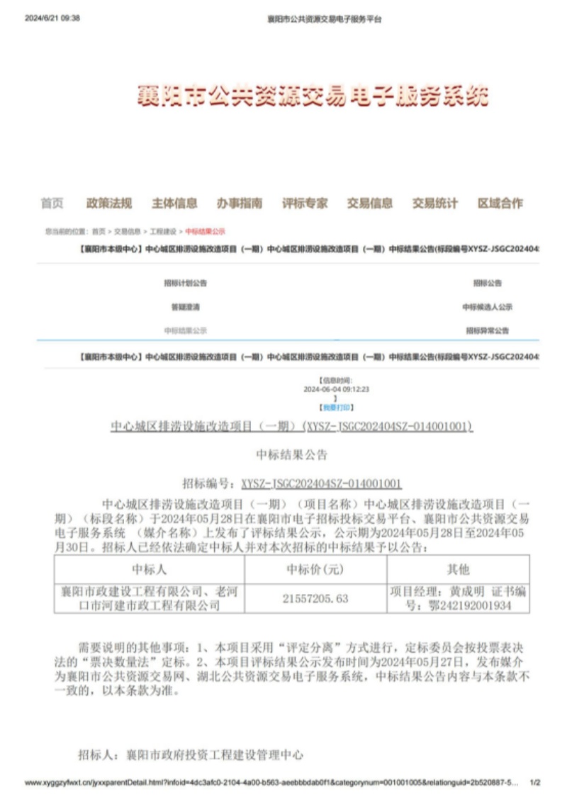 2024年6月4日,襄陽(yáng)市政建設(shè)工程有限公司成功中標(biāo)中心城區(qū)排澇設(shè)施改造項(xiàng)目(一期),中標(biāo)金額2155.720563萬(wàn)元,合同工期200日歷天。