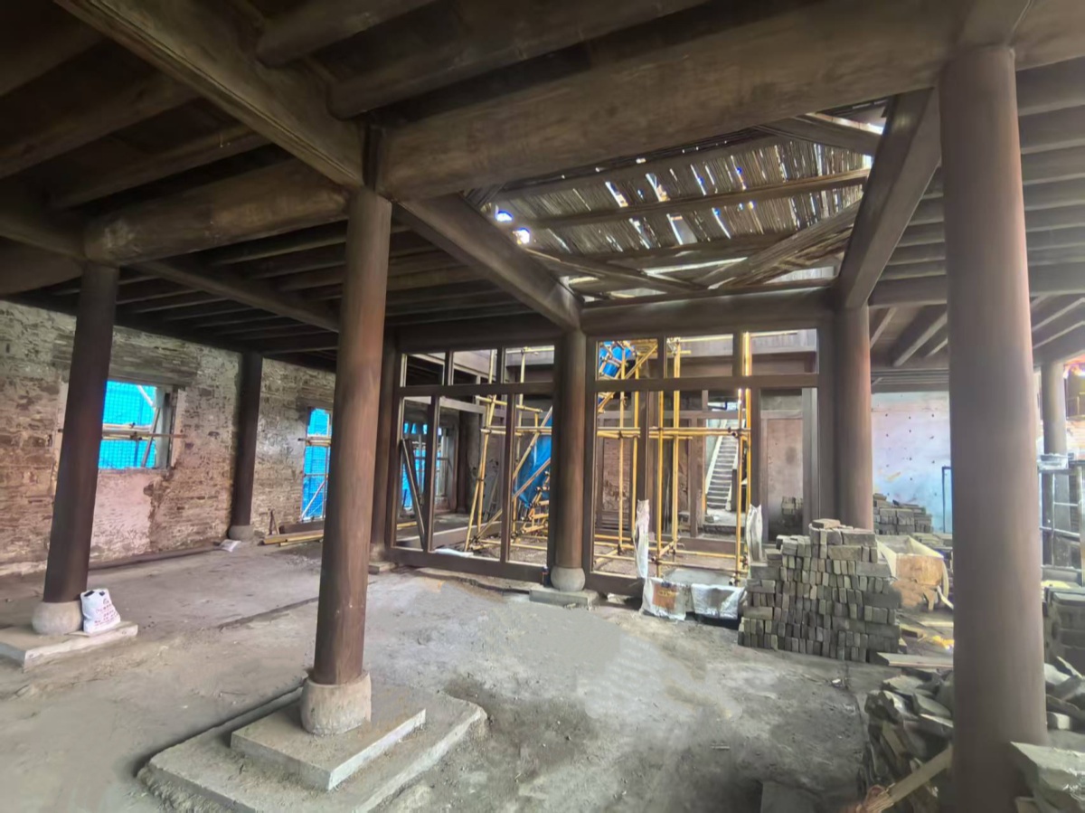 項目部秉持“修舊如故”原則,組建了一支由30余位資深古建筑匠人組成的專業(yè)團隊,在施工過程中嚴格執(zhí)行傳統(tǒng)工藝標準,采用傳統(tǒng)榫卯結構拼裝工藝,運用木材數(shù)字編碼實現(xiàn)精準裝配,僅歷時七日,便完成了整棟建筑木結構主體的搭建施工。當前,屋面系統(tǒng)完成望板鋪裝與防水體系構建,室內(nèi)木作工程全面告竣,已完成總體進度的70%,下階段將重點推進清水磚墻修復、傳統(tǒng)小青瓦屋面鋪設及門窗構件復原工作。