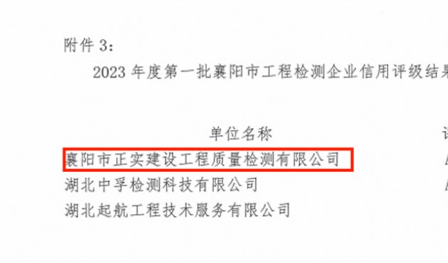 正實公司榮獲襄陽市工程檢測企業(yè)AAA級信用機構(gòu)