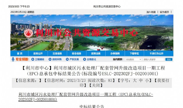 2023年3月23日,漢江城建集團(tuán)有限公司牽頭中標(biāo)利川市城區(qū)污水處理廠配套管網(wǎng)升級(jí)改造項(xiàng)目一期工程(EPC)總承包項(xiàng)目,合同估算價(jià)3
