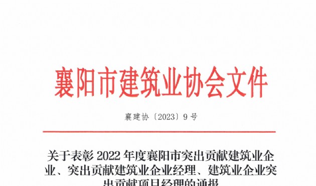 喜訊:漢江城建榮獲“2022年度襄陽(yáng)市突出貢獻(xiàn)建筑業(yè)企業(yè)”稱號(hào)