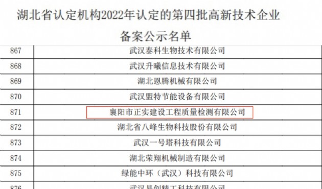 近日,漢江城建的全資子公司襄陽市正實建設工程質量檢測有限公司正式通過了國家高新技術企業(yè)認證,憑借專業(yè)的研發(fā)隊伍,雄厚的技