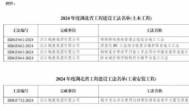 近日,湖北省住房和城鄉(xiāng)建設(shè)廳發(fā)布2024年度湖北省工程建設(shè)工法公告,由漢江城建申報的《喀斯特地貌嵌巖灌注樁組合施工工法》《深