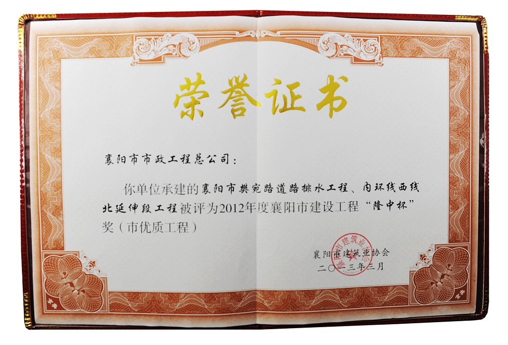 2012樊宛路工程襄陽(yáng)市“隆中杯”證書(shū)