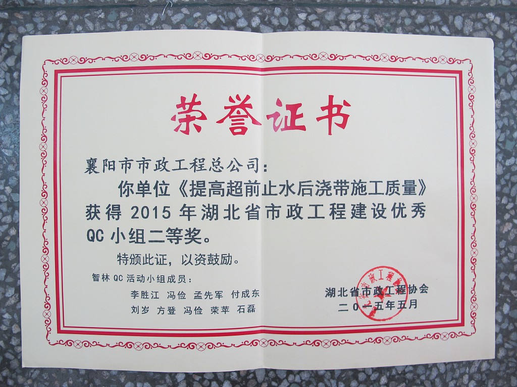 2015超前止水后澆帶施工質(zhì)量湖北省優(yōu)秀QC二等獎