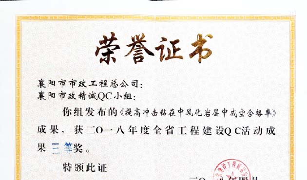 2018年“提高沖擊鉆在中風(fēng)化巖層中成空合格率”全省工程建設(shè)QC活動(dòng)成果三等獎(jiǎng)