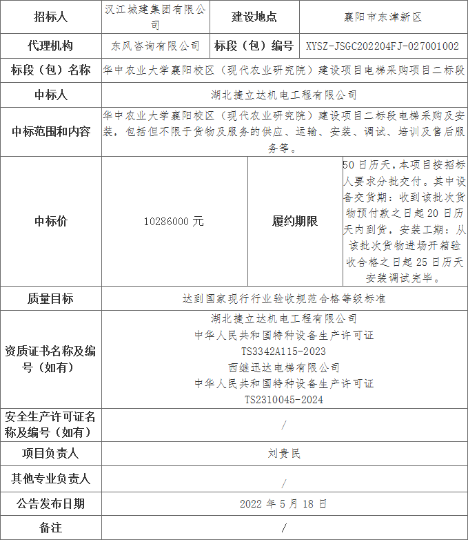 華中農業(yè)大學襄陽校區(qū)(現(xiàn)代農業(yè)研究院)建設項目電梯采購項目二標段于2022年5月 10日在襄陽市公共資源交易網(wǎng)、湖北省公共資源交易電子服務平臺、漢江城建集團有限公司官網(wǎng)發(fā)布中標候選人公示,公示期為2022年5月10日至2022年5月12日(北京時間)。公示期間無異議、投訴,F(xiàn)對本次招標的中標結果公示如下: