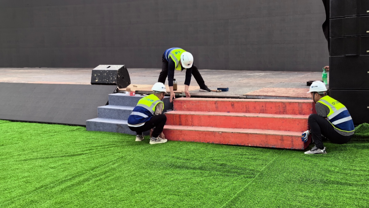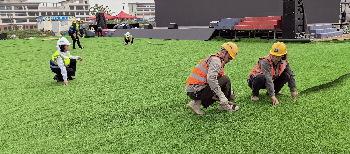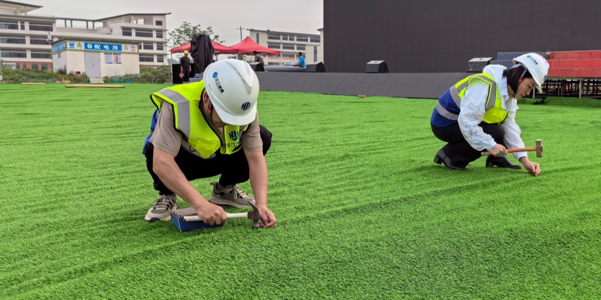 籌備小組在接到通知的第一時間,迅速進駐場地,制訂工作計劃,明確專人專班,緊鑼密鼓地開展各項準備工作。對此次競賽的各種材料、機具等進行專人配送,確保賽前所用物資及時到位。針對湖北文理學(xué)院遷建項目場地的特殊性,現(xiàn)場還增配了兩間移動公廁,沿途安裝了道路指引旗幟,為參賽人員做好后勤保障服務(wù)。24日,黨支部書記崔海玲帶領(lǐng)班子成員及全體黨員對競賽現(xiàn)場的準備工作進行了再梳理、再檢查、再安排,并帶領(lǐng)全體員工進行場地草皮鋪設(shè),通過擺位鋪裝、剪裁、拼接、打釘固定等步驟,打造綠色、統(tǒng)一、美觀的賽事場地。此外,滅火器、救援箱等應(yīng)急保障物資也在24日全部運送至競賽現(xiàn)場。