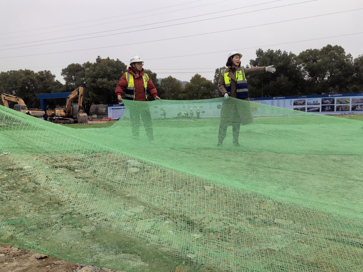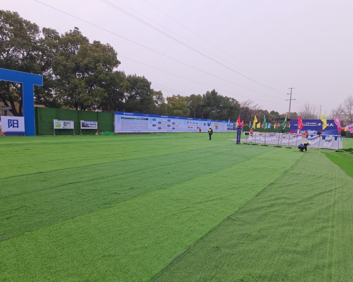 籌備小組在接到任務的第一時間趕赴項目現(xiàn)場,劃分責任區(qū),明確任務分工,通過擺位鋪裝、剪裁、拼接、打釘固定等步驟進行場地草皮鋪設,對裸露土方用科學合理的鋪設方法進行全面覆蓋,確保防塵網(wǎng)鋪設平整、牢固,邊緣壓實到位,同時,組織施工人員加班加點進行圍擋的草皮鋪設及噴繪安裝。在時間緊、任務重的情況下,黨員帶頭攻堅,確保每個環(huán)節(jié)精準到位,于18日晚高標準完成了整個場地的布置工作,為開工儀式的順利舉行奠定了堅實基礎。